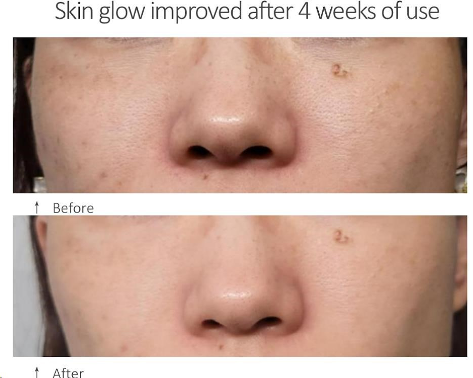 - Viditeľné výsledky už za 4 týždne: Klinické testy preukazujú zlepšenie jasu pleti, zosvetlenie škvŕn a zmiernenie začervenania.