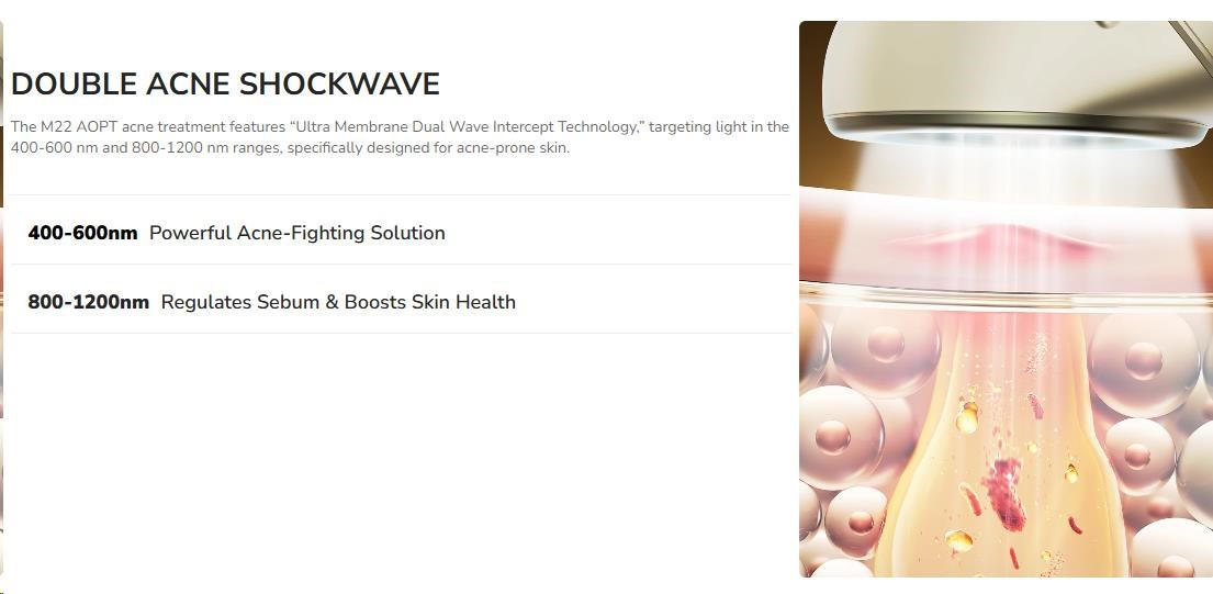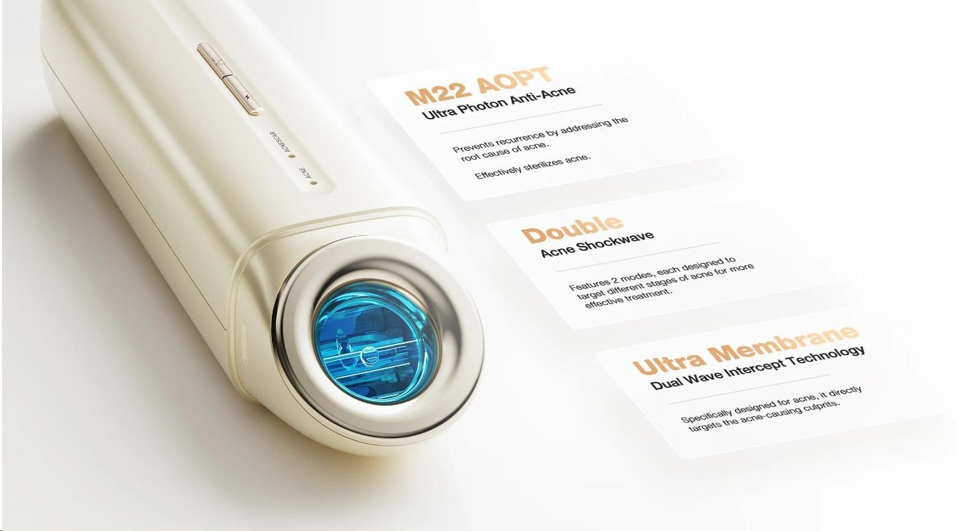 Tento inovatívny prístroj využíva unikátnu "svetelno-biologickú" technológiu na maximálny efekt. Dvojitá rádiová vlna intenzívneho pulzného svetla preniká hlboko do pokožky, kde ničí baktérie Propionibacterium acnes a reguluje produkciu mazu.