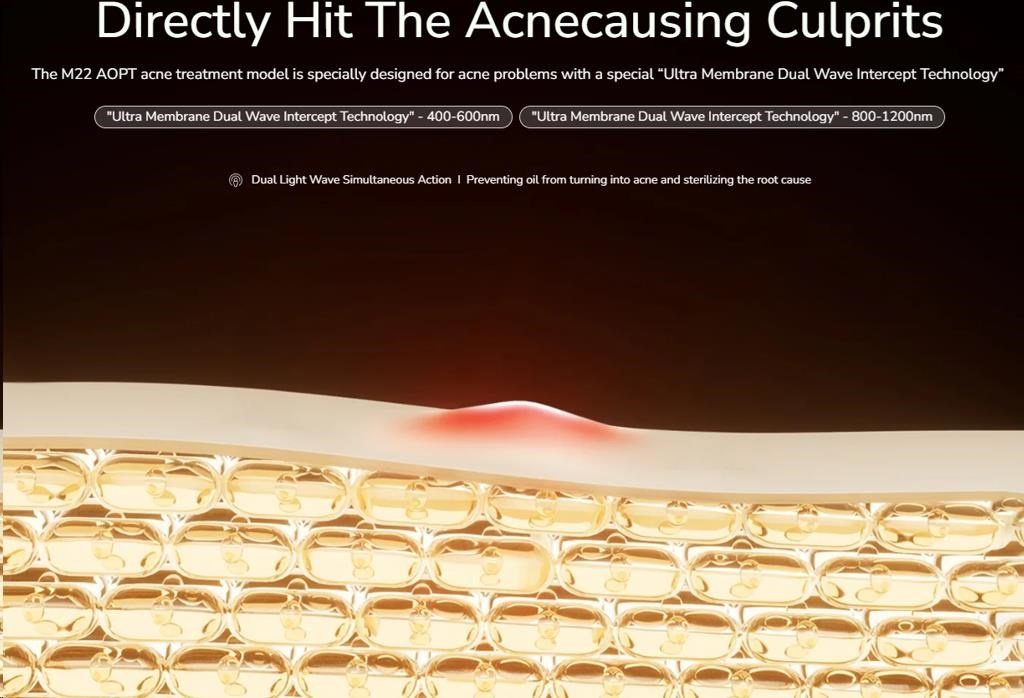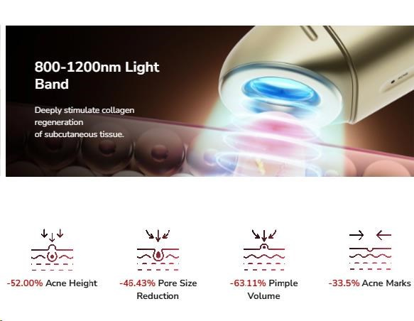 - Dvojitá rádiová vlna svetla: Kombinuje dve pásma (400-600nm & 800-1200nm) pre komplexný účinok – ničenie baktérií a reguláciu mazu.