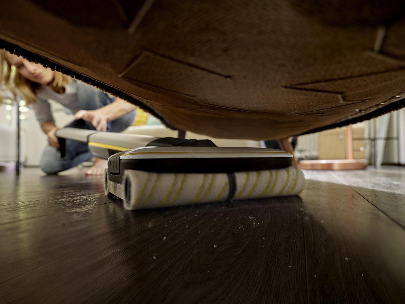 ** Čistič podláh Kärcher skracuje dobu upratovania až o 50 %, pretože bežné nečistoty z domácnosti je možné odstrániť z tvrdých podláh v jedinom kroku, bez potreby vysávania pred vytieraním.
