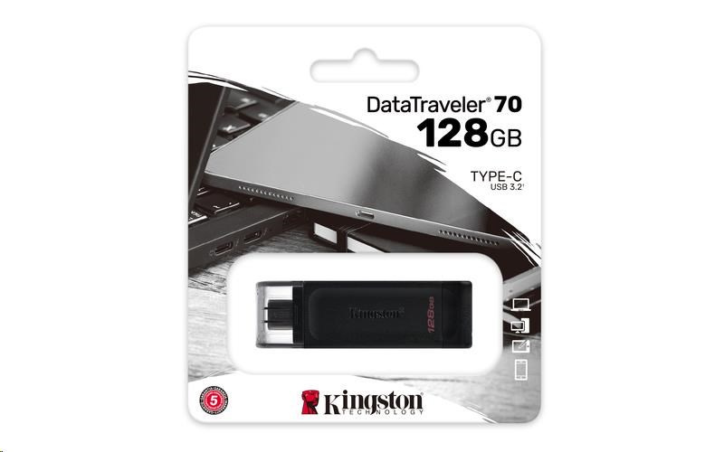 Kingston DataTraveler 70 je prenosný a ľahký flash disk s rozhraním USB-C, ktorý ponúka rýchlosť USB 3.2 1. generácie. Je určený na používanie s kompatibilnými zariadeniami USB-C, ako sú notebooky, tablety a telefóny. Vďaka kapacite až 128 GB je DataTraveler70 skvelým spôsobom, ako rozšíriť úložisko na každodenné používanie. Dodáva sa s päťročnou zárukou a bezplatnou technickou podporou.