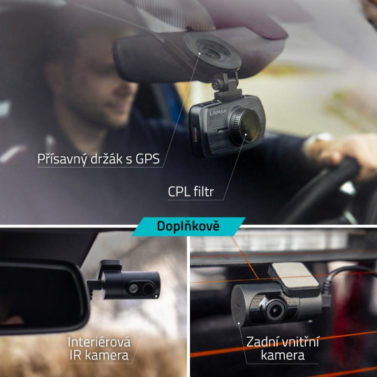 Dokúpiť možno bohaté príslušenstvo, vrátane zadnej kamery, interiérovej kamery s infrared prísvitom pre super nočné zábery, CPL filtra alebo prísavného držiaka s GPS.