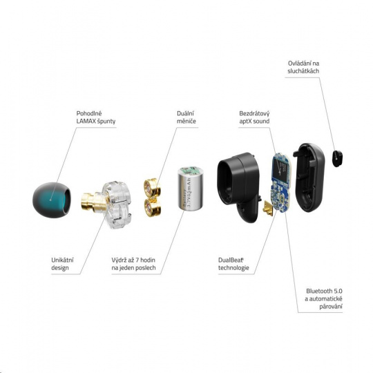 V čom je vtip duálnych meničov s našou LAMAX DualBeat® technológiou? Každý menič sa stará o svoje zvukové spektrum. Pre tučný basy používame o tretinu ľahšiu titanovú membránu, pre krištáľovo čisté stredy a výšky naopak membránu so silnou tuhosťou. Perfektný pomer frekvencií pre každý track z tvojho playlistu potom riadi naše LAMAX DualBeat® technológia, ktorá oba výstupy pošle na finálny mix až do tvojho ucha. Navyše v top bezdrôtovej kvalite, vďaka kodeku aptX, ktorý boostuje prenosovú rýchlosť Bluetooth 5.0.