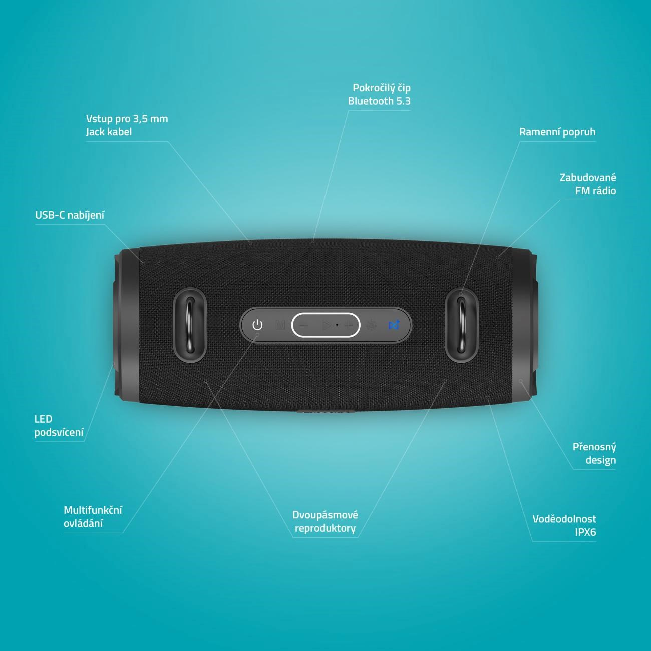 Je jedno, či máš playlist na párty na jednom zariadení a obľúbený podcasty na inom, cez najmodernejšie Bluetooth 5.3 sa reprák automaticky spáruje s akýmkoľvek zariadením a frčí až na vzdialenosť 15 metrov. Trápiť ťa nemusia ani formáty, táto mašinka podporuje MP3, WAV, FLAC a široká je aj škála podporovaných pripojení - Micro SD, USB-A, 3,5 mm AUX. Parádnou záležitosťou je tiež možnosť naladenia FM rádia napríklad pre prípady, keď si zabudneš vlastnú muziku. A keďže každá udalosť si žiada správnu atmošku, máš na výber z 5 nastaviteľných LED efektov.