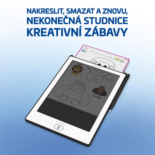Či už si deti chcú kresliť zvieratká, trénovať prvé písmená alebo len tak čmárať, čo ich práve napadne, LAMAX PencilKid1 im poskytne priestor na nekonečné tvorenie. Kresliaca tabuľka so 40 zábavnými obkresľovacími šablónami pomáha rozvíjať kreativitu, jemnú motoriku aj základy angličtiny. Predlohy ich zábavným spôsobom zoznámia s písmenami, číslami, zvieratami, dopravnými prostriedkami alebo napríklad ovocím, a vďaka anglickým popisom sa deti prirodzene dostávajú aj k prvým cudzojazyčným slovíčkom. Tabuľka ale nie je určená len pre najmenších. Ľahko si ju obľúbia aj staršie deti, ktoré si do nej môžu zapisovať nápady alebo domáce úlohy do školy. Veľká plocha ponúka dostatok miesta na písanie aj kreslenie a je zároveň šetrná k očiam, pretože nebliká a nevydáva modré svetlo. Po každom použití stačí jediné stlačenie tlačidla a plocha je pripravená na nové nápady. Vďaka praktickému obalu v tvare knižky zostane tabuľka aj so šablónami pekne pohromade a deti si ju môžu vziať kamkoľvek – do školy, na výlet, k babičke alebo do čakárne u lekára. A čo je najlepšie? Nie je potrebný žiadny papier, pastelky ani fixky. Len jeden ľahký pomocník, ktorý podporuje tvorenie, učenie aj zábavu vo chvíľach, keď potrebujete mať trochu pokoj.