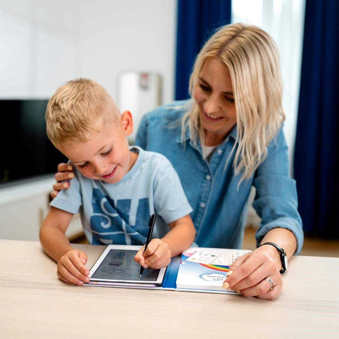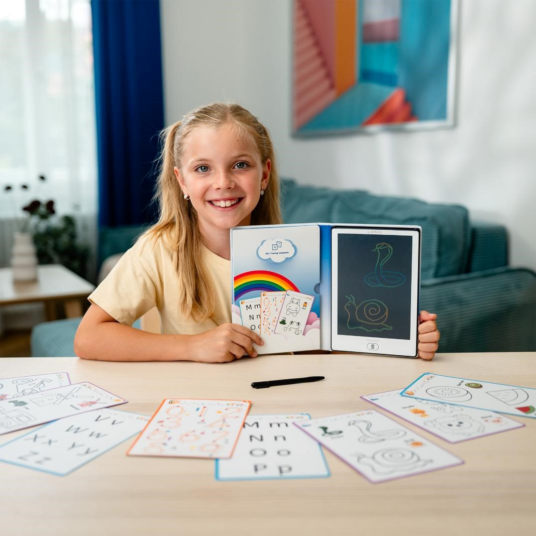 Veľká plocha tabuľky ponúka množstvo miesta na kreslenie aj zapisovanie nápadov, a pritom zostáva šetrná k detským očiam. Displej nebliká, nevyžaruje modré svetlo a nenamáha zrak ani pri dlhšom používaní. Celý set, tabuľka aj šablóny, je navyše uložený v praktickom obale v tvare knižky, vďaka ktorému zostane všetko pekne pohromade a deti si tak môžu vziať zábavu kamkoľvek so sebou.