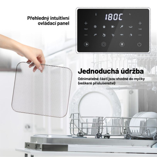 Lauben Hot Air Fryer Oven 1500SB funguje na princípe 360° cirkulácie horúceho vzduchu, ktorý jedlo ohrieva zo všetkých smerov, a nie je tak potreba použiť takmer žiadny olej. Vďaka pachovému filtru môžete na nevábnu vôňu, ktorá bežne sprevádza smaženie a pečenie, kľudne zabudnúť. Rúru sme navyše vybavili digitálnym dotykovým displejom, na ktorom si môžete zvoliť buď jeden z prednastavených programov, alebo manuálne nastaviť teplotu a čas prípravy. Jak je u nás zvykom, v základnom balení nájdete kompletnú výbavu.