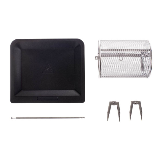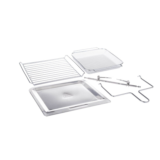 1 klasická mriežka na plech alebo rôzne formy, 1 rotačný kôš na hranolky, 1 hlbšia mriežka na pečenie kuracích krídiel, zemiakov, 1 plochá mriežka na sušenie ovocia či hríbov, 1 odkvapkávací plech, ktorý zachytáva tuk a olej, ihla na grilovanie celého kuraťa, úchyt.