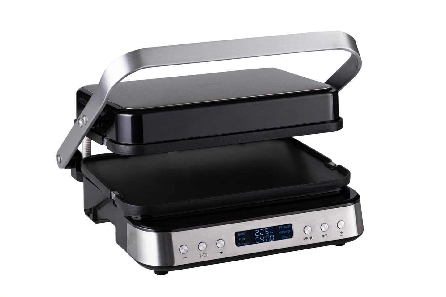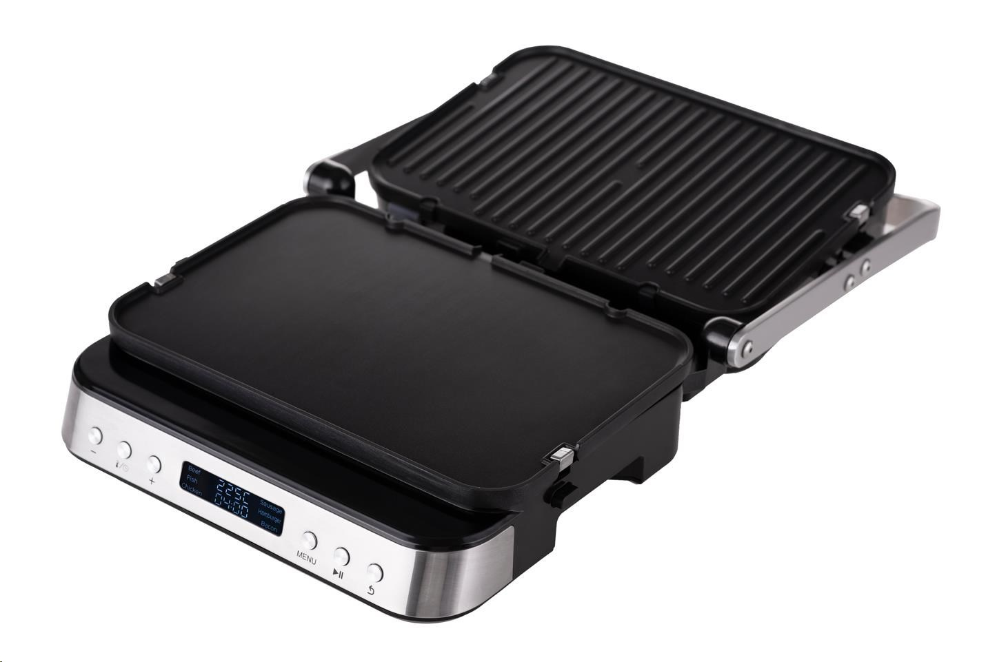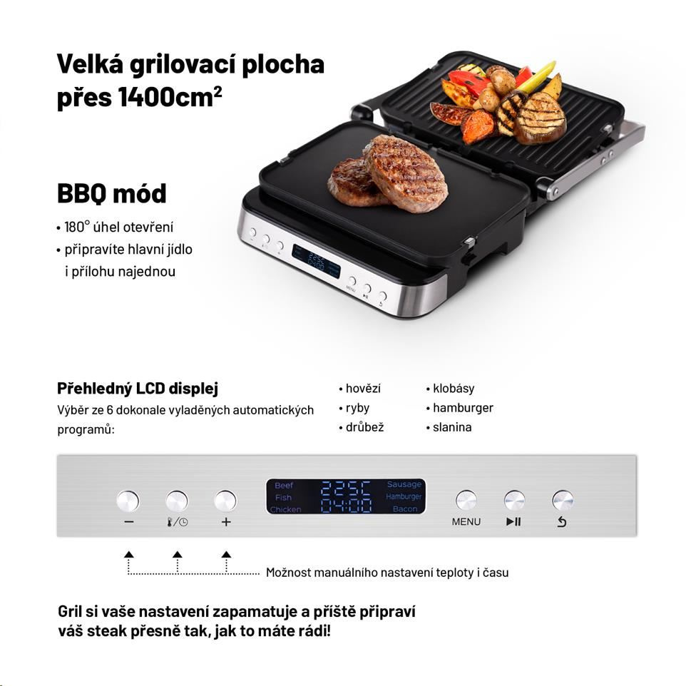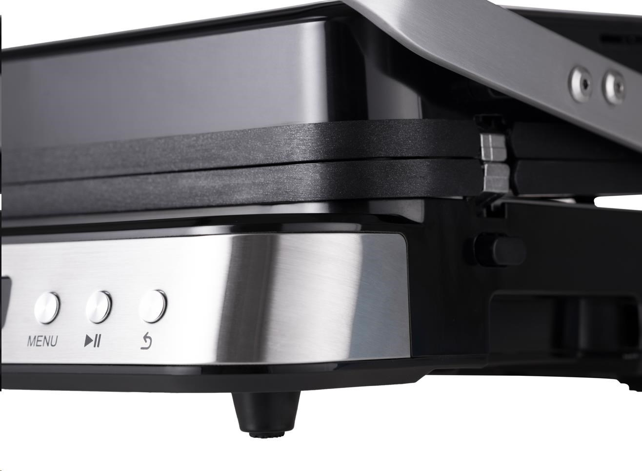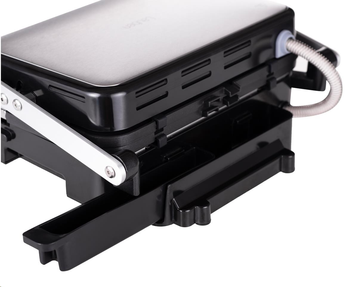 Kontaktný gril na zapekanie, ktorý po uvedení do vodorovnej polohy pretvoríte na plnohodnotný stolný gril s plochou 1400 cm2.