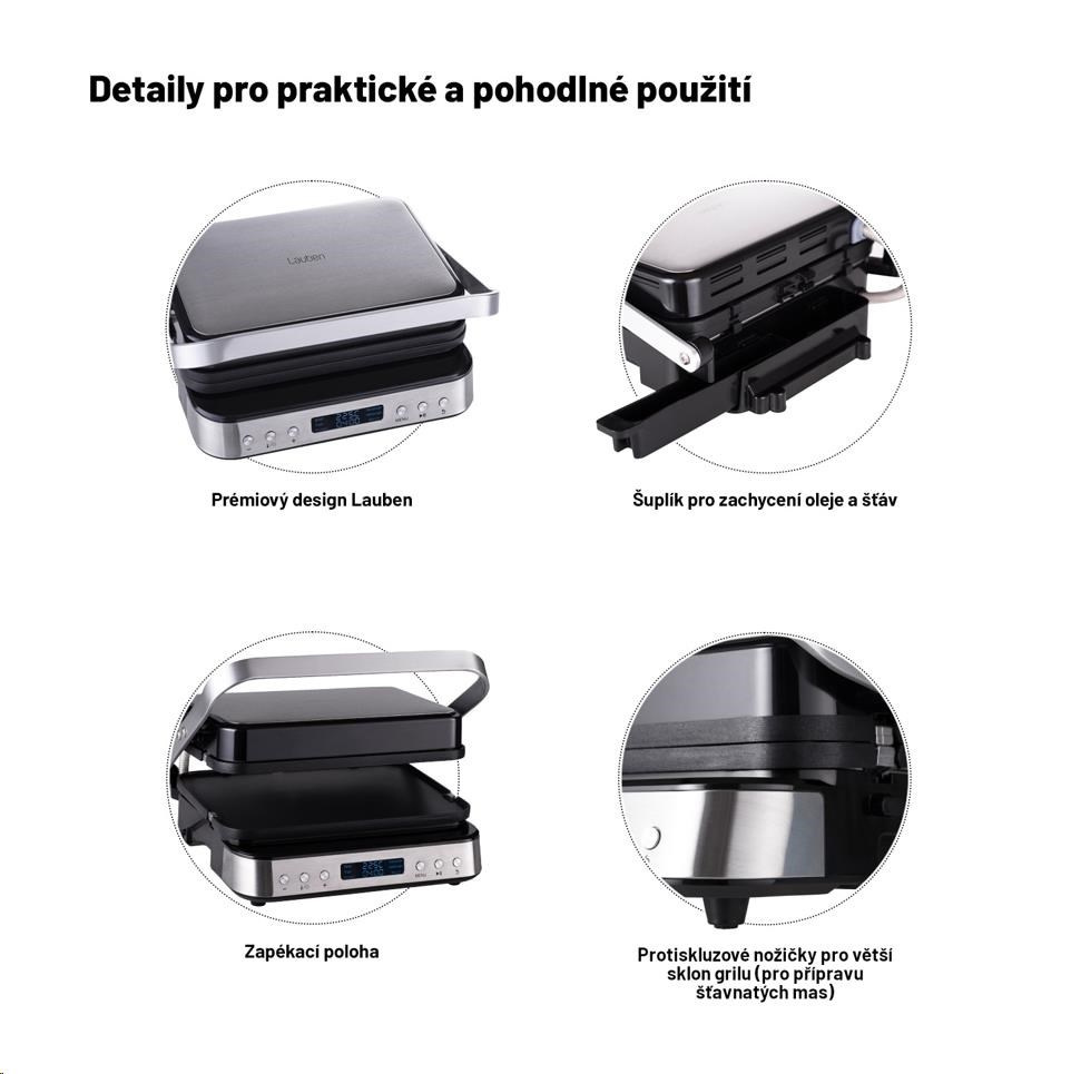 K grilovaniu nemusí nutne patriť nosenie ťažkého uhlia, množstvo dymu a ani špina. Kontaktný gril Lauben stačí uviesť do vodorovnej polohy, zvoliť jeden z ponúkaných programov, prípadne upraviť teplotu a čas prípravy, a potom už sa len tešiť na dokonalý výsledok. Gril je veľmi nenáročný na údržbu, prebytočné tekutiny odtekajú do odkvapkávacej misky a platničky sú vhodné do umývačky riadu, takže odpadá starosť so zdĺhavým čistením. S obsluhou grilu si poradí každý, na ovládanie slúží 6 tlačidiel a prehľadný LED displej. Polohu grilu nastavíte pomocou rukväte, ktorá disponuje Cool Touch funkciou, takže sa o ňu nikdy nespálite. Všetko, čo potrebujete vedieť k obsluhe a manipulácii, sa dozviete z video tutoriálu.