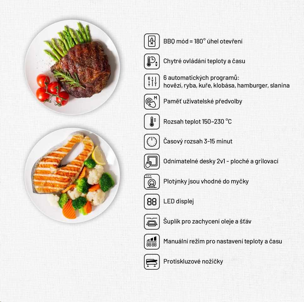 Gril ponúka 6 automatických programov, ktoré sú na mieru ušité rôznym surovinám. Teplotu aj čas prípravy môžete nastaviť takisto manuálne, gril si vašu voľbu zapamätá a môžete ju využiť aj nabudúce.