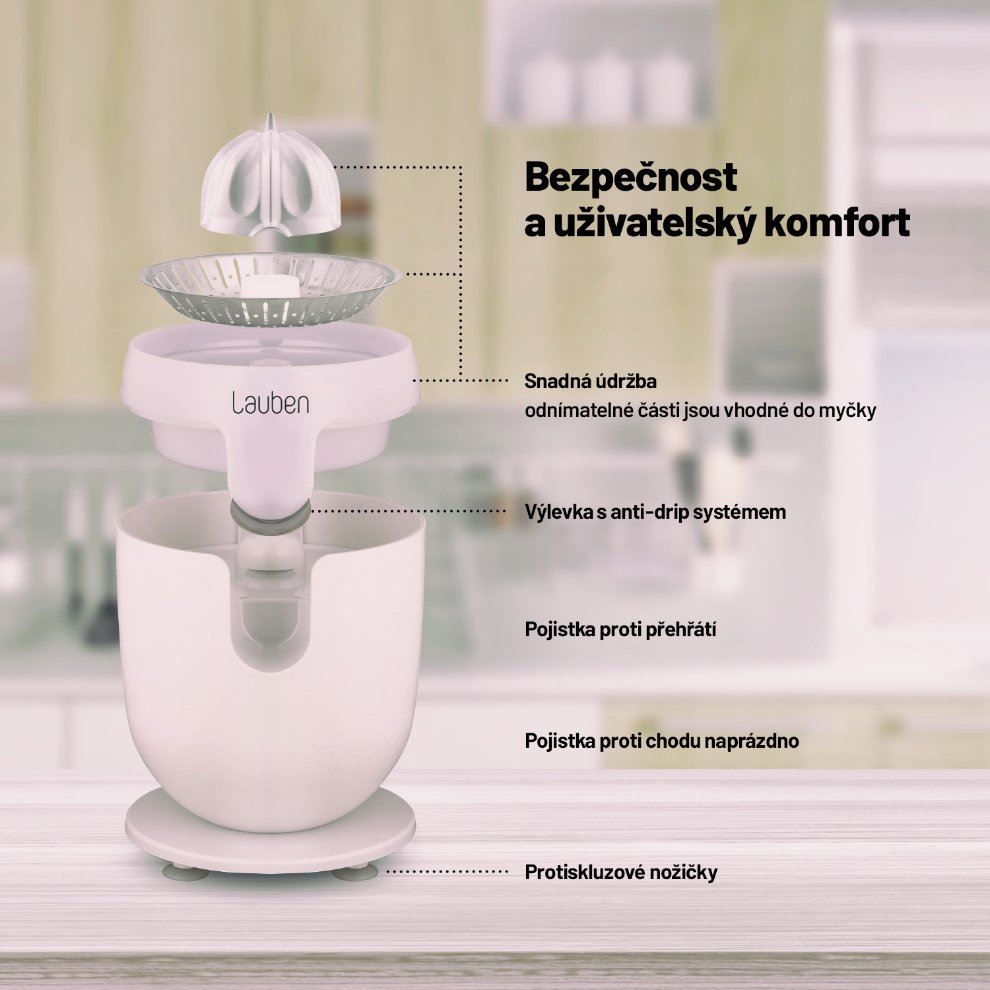 Šťava plná vitamínov jednoducho a rýchloZástancovia zdravého životného štýlu by vo svojej domácnosti nemali chýbať pomocník v podobe elektrického citrusovača Lauben Electric Citrus Juicer 110WT. Jeho čistý dizajn ozdobí každú kuchynskú linku, ktorú vďaka funkcii Anti Drip nepoškvrní ani kvapkou šťavy. Funkcia proti odkvapkávaniu zabezpečuje, že džús prúdi priamo do pohára alebo zostáva v zásobníku. Rýchlosť otáčok pri odšťavovaní je nastavená tak, aby si šťava uchovala maximum vitamínov. Chuť navyše nie je nijak ovplyvnená, pretože časti prichádzajúce do kontaktu s ovocím sú nerezové alebo z plastu splňujúceho najprísnejšie nariadenia EÚ a neuvoľňujú žiadnu pachuť ani arómu. Tvar kužeľa a nastaviteľná páka proces odšťavovania zefektívňujú a tichý chod umožňuje prípravu džúsu hocikedy. Bezpečný chod zabezpečujú protisklzové nožičky a poistka znemožňujúca spustenie, ak lis nie je riadne zostavený. Určite poteší aj ľahká údržba, odnímateľné časti stačí vložiť do umývačky.