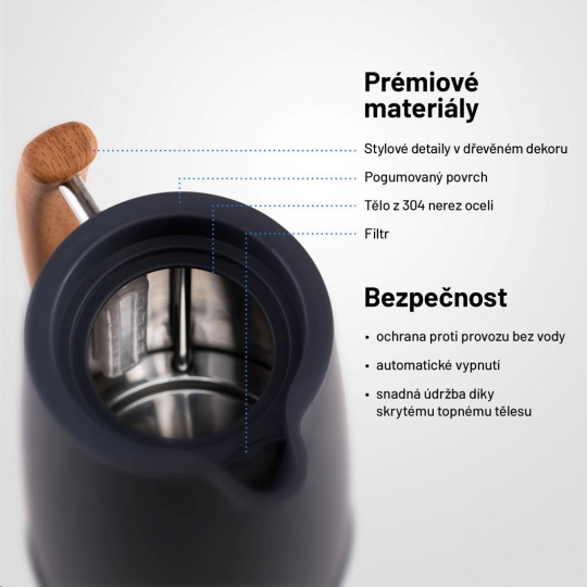 Telo konvice je vyrobené z #304 nerezovej ocele s pogumovaným povrchom.