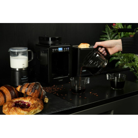 Doprajte si každý deň pokojnú chvíľku so šálkou lahodnej prekvapkávanej kávy. Kávovar Lauben Grind&Drip Coffee Maker 600BB ju pripraví behom chvíľky z čerstvo namletých zŕn vďaka zabudovanému mlynčeku. Nepotrebujete tak ďalšie príslušenstvo, odpadá aj presýpanie kávy z mlynčeka. Hoci vie pripraviť aj kávu z už namletých zŕn, čerstvo umletá chutí najlepšie. Funkcia Keep Warm navyše zaistí, že si nápoj užijete vždy horúci. Všetko potrebné nastavíte na prehľadnom digitálnom displeji a potom už len čakáte, než do sklenenej kanvice prekvapká čierny mok. Čakanie vás ušetrí funkcia časovača, ktorá zaistí, že bude káva pripravená na požadovaný čas. Systém Antidrip navyše umožňuje naliatie kávy ešte pred dokončením cyklu. Bezpečnosť kávovaru prémiového kompaktného dizajnu zaisťuje funkcia automatického vypnutie a technológia Cool Touch. Čas ušetrí jednoduchá údržba, ku ktorej prispieva aj umývateľný filter z nerezovej ocele. Nie je potrebné stále dokupovať papierové jednorazové filtre, takže šetrí vašu peňaženku a tiež životné prostredie.