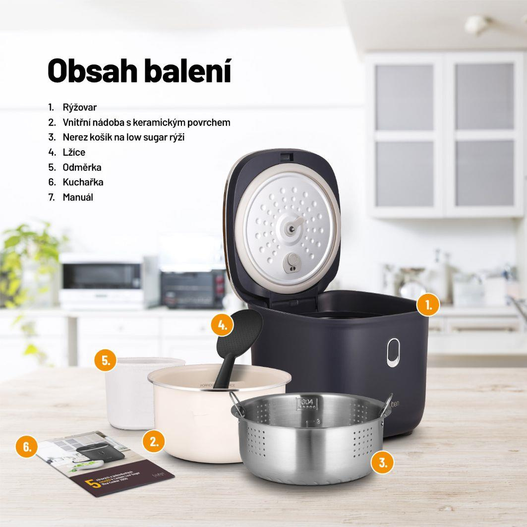 Ak chcete jesť zdravšie, multiúčelový ryžovar Lauben Low Sugar Rice Cooker 3000AT by vám nemal chýbať. Jeho funkcia low sugar odstráni až 40 % sacharidov z ryže. Prístroj si poradí so všetkými druhmi ryže, ale aj s ďalšími ingredienciami, napríklad strukovinami. Môžete si vybrať zo 6 režimov, ktoré je však možné ručne upraviť. Prémiový neprilnavý keramický povrch jeho 3l nádoby pripraví jedlo pre celú rodinu bez potreby používania tuku a obáv z pripálenia. Teší sa z funkcie Keep Warm, ktorá udrží pokrmy teplé bez rizika rozvarenia, odloženého štartu alebo ochrany proti pretečeniu a technológie Cool Touch, vďaka ktorej sa nepopálite o ryžovar. Dotykové tlačidlá uľahčujú nastavenie ryžovaru. Jednoduchá údržba je samozrejmosťou, stačí vložiť vnútornú časť do umývačky. Ako inšpiráciu sme pridali aj kuchárku.