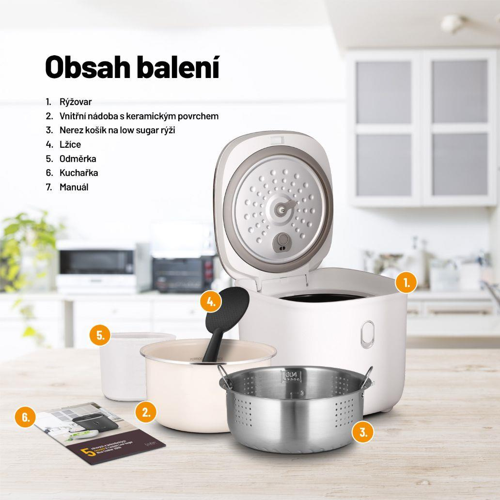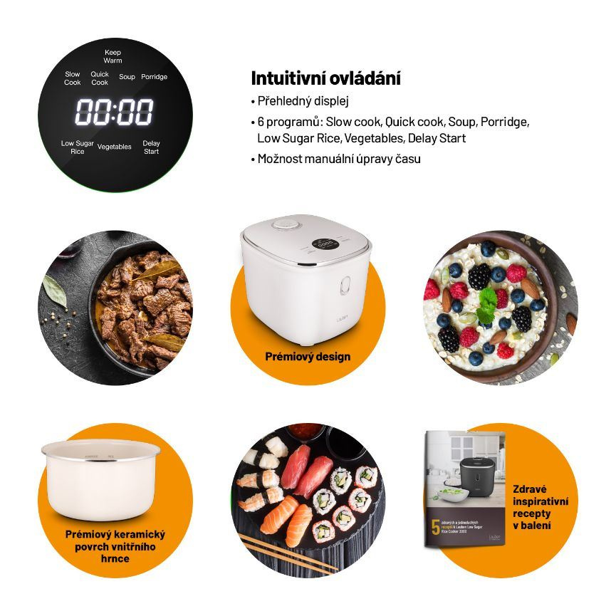 Chcete jesť zdravšie, viacúčelový parný hrniec Lauben Low Sugar Rice Cooker 3000WT nesmie chýbať. Jeho funkcia low sugar zbaví ryžu až 40 % sacharidov. Prístroj si poradí so všetkými druhmi ryže, ale aj s ďalšími surovinami, napríklad strukovinami. Môžete si zvoliť zo 6 režimov, ktoré je však možné ručne upraviť. Prémiový neprilnavý keramický povrch jeho 3l nádoby pripraví jedlo pre celú rodinu bez nutnosti použitia tuku a obáv zo pripálenia. Poteší funkci Keep Warm, ktorá udrží pokrmy teplé bez nebezpečenstva rozvarenania, odložený štart či ochranu proti pretečeniu a technológiu Cool Touch, vďaka ktorej sa nepopálite o ryžovar. Dotykové tlačidlá uľahčujú nastavenie ryžovaru. Jednoduchá údržba je samozrejmosť, stačí dať vnútornú časť do umývačky. Na inšpiráciu sme pridali tiež kuchárku.