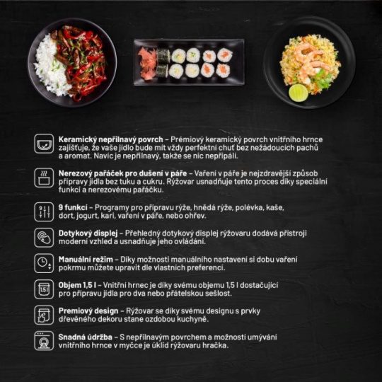 Ovládanie multifunkčného rýžovaču zvládne úplne každý pomocou prehľadného dotykového displeja, kde stlačením tlačidla aktivujete zvolenú funkciu alebo si manuálne nastavíte hodnoty podľa potreby. V 1,5 l hrnci s nepriľnavým povrchom pohodlne pripravíte jedlo pre celú rodinu alebo spoločenské stretnutie. Stačí ho potom vyňať a vložiť do umývačky, žiadne zložité drhnutie. Súčasťou balenia je tiež praktická odmerka a lyžica na ryžu.