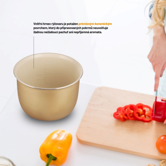 Užívajte si viac času na iné aktivity a varenie zverte multifunkčnému rýžovaču, ktorého 9 prednastavených programov si poradí s prípravou najrôznejších pokrmov. Programy ako ryža, hnedá ryža, polievka, kaša, zákusok, jogurt, kari, varenie v pare alebo ohrev sú zárukou snadného a rýchleho varenia. Prémiový keramický povrch vnútorného hrnca navyše neuvoľňuje žiadnu nežiaducu pachute ani arómu, príprava pokrmov je tak zdravšia. Ak chcete svoj životný štýl ešte vylepšiť, využite nerezový parník na dusenie v pare. Parník je navrhnutý tak, že šťavy z pripravovaného jedla nekvapú do ryže pod ním.