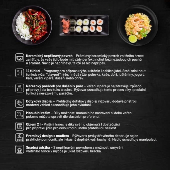Užite si viac času na iné aktivity a varenie zverte viacúčelovému rýžovaru, ktorého 12 prednastavených programov si poradí s prípravou najrôznejších pokrmov. Programy ako ryža, "claypot" ryža, hnedá ryža, polievka, kaša, koláč, strukoviny, jogurt, kari, varenie v pare, dusenie či ohrievanie sú zárukou ľahkého a rýchleho varenia. Prémiový keramický povrch vnútorného hrnca navyše neuvoľňuje žiadnu nežiaducu chuť ani arómu, príprava jedál je tak zdravšia. Ak chcete svoj životný štýl ešte vylepšiť, využite nerezový parník na dusenie v pare.
