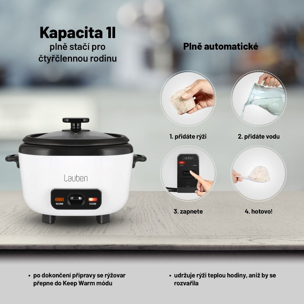 Uvariť vláčnu a nadýchanú ryžu je často oveľa ťažšie, než by sa mohlo zdať. S ryžovarom Lauben je to ale rovnako jednoduché, ako si túto obľúbenú prílohu vychutnať. Jeho využitie je všestranné, pripravíte v ňom akýkoľvek druh ryže presne al dente, stlačením jedného tlačidla. Ale poradí si aj s inými surovinami. Počas niekoľkých minút zvládne pre vás urobiť chutné polievky, krémovú cereálnu kašu alebo strukoviny bohaté na bielkoviny. Samozrejmosťou je funkcia Keep warm, vďaka ktorej je ryžovar schopný udržať ryžu teplú tak dlho, ako potrebujete, bez rozvarenia a straty dokonalého chuti alebo štruktúry.
