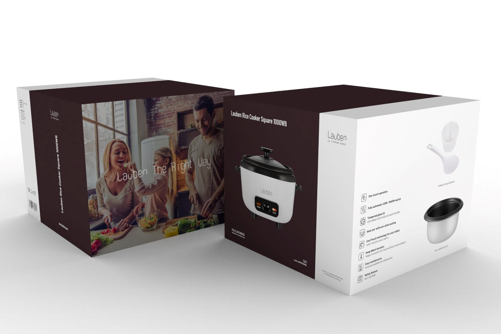 Oproti ostatným ryžovarom je Lauben Rice Cooker Square 1000WB príkladom skvelej kombinácie funkčného a štýlového dizajnu. Nie len že dobre vyzerá, ale vďaka svojmu hranatému tvaru je taktiež kompaktný a ľahko sa skladovať. Pokrievka ryžovaru je z tvrdeného skla, preto máte lepšiu kontrolu nad stavom pripravovaného jedla. Zároveň je vybavená otvorom pre únik prebytočnej pary. Samozrejmosťou sú protisklzové nožičky, vďaka ktorým ryžovar vždy zostane na svojom mieste. Povrch vnútornej nádoby ryžovaru je neprilnavý, takže ryžu môžete pripravovať bez tuku, a predsa sa nikdy nepripáli. Technologie Cool touch zase zabezpečí, že sa o neho nikdy nespálite vy.