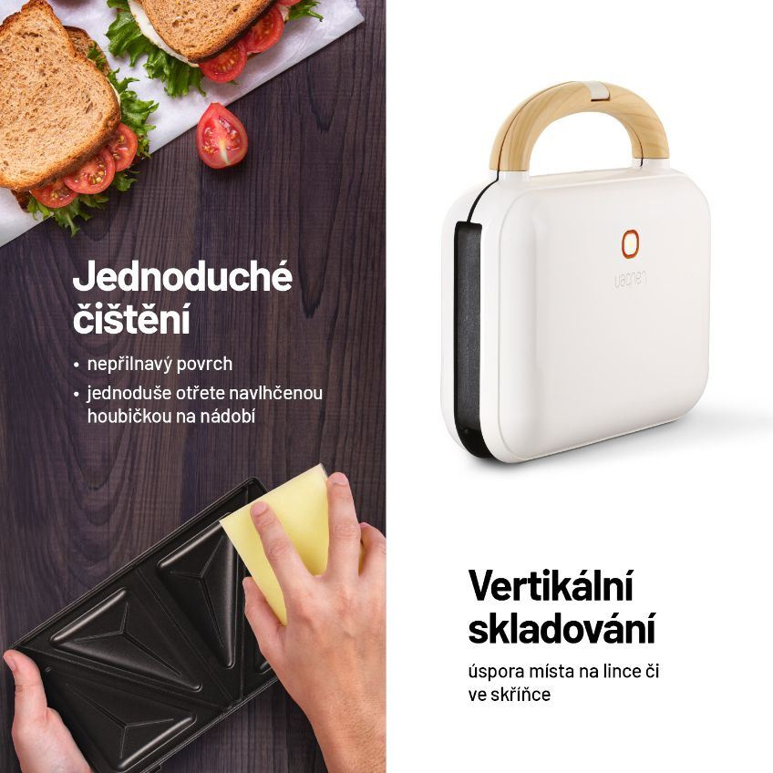 Chrumkavá raňajky, desiata aj rýchla večeraNemáte práve čas na prípravu teplého večere alebo vydatnej raňajky? S toastovačom Lauben zvládnete oboje za pár minút. Klasickými toasty so šunkou a syrom potešíte každé dieťa, rozhodne však u nich nemusíte skončiť. Sendvičovač Lauben si vďaka 3 sadám platní poradí aj so raňajkovou vafľou alebo grilovaním mäsa. Nahrejete ho behom chvíle a jedlo budete mať hotové skôr, než sa vám podarí všetkých svolať ku stolu. Teší vás aj ľahká údržba a skladovanie. Sendvičovač vertikálne uložíte do kuchynskej skrinky a vymeniteľné platne sa ľahko utrú hladkou stranou špongie na riad. Vďaka integrovaným protisklzovým nožičkám zostane počas prípravy jedla na mieste. Mysleli sme aj na bezpečný prevádzka. Cool Touch držadlo zabezpečí, že sa nikdy nespálite a prevádzku indikuje LED kontrolka na povrchu prístroja. Pridanou hodnotou je prémiový dizajn značky Lauben. Trendové off white prevedenie s dreveným dekorom sa totiž skvele hodí do každej kuchyne.