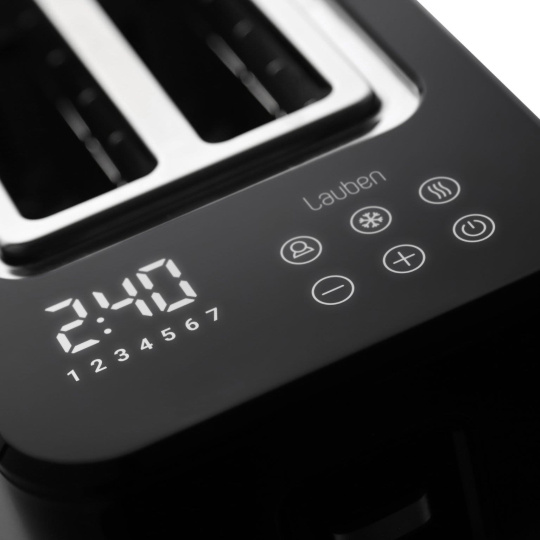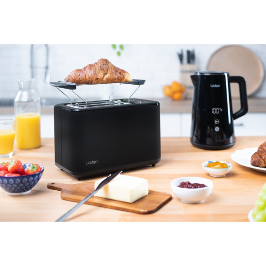 Chrumkavý toast na raňajky natretý maslom predstavuje pre mnohých dokonalý začiatok dňa. S Lauben Toaster 900BC získajú vaše raňajky či desiaty úplne nový rozmer, vďaka digitálnemu nastaveniu na dotykovom displeji máte na výber zo 7 stupňov intenzity opečenia. Dokonca si môžete uložiť svoj obľúbený stupeň opečenia. Ak si nie ste istí, ako moc opekať, proces môžete kedykoľvek manuálne ukončiť. A ak sa stane, že toast trochu vychladne, môžete si ho prehriať funkciou Reheat. Rýchle je aj rozpiekanie pečiva, keď stačí dať obľúbený croissant na ohrevnú mriežku, zapnúť a je ako z pekárne. Pomocou funkcie Defrost môžete všetko ľahko rozmraziť. Údržba topinkovača nie je zložitá, stačí vybrať táck na drobky a vysypať. Vylepšenú kuchynskú linku získate s varnou konvicou v rovnakom dizajne.