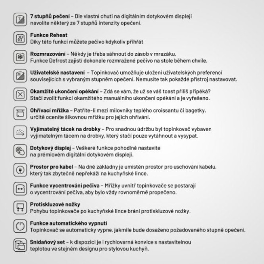 V topinkovači rýchlo pripravíte dokonalý chrumkavý toast presne tak, ako máte radi. Stačí nastaviť jeden zo 7 stupňov intenzity. Svoje preferencie si potom uložíte na ďalšie použitie. Ak skúšate nový chlieb a pripéká sa, môžete kedykoľvek ručne prerušiť opekanie. Nestiháte? Nevadí, s funkciou Reheat môžete pečivo ľahko prehriatie. Niekedy je tiež potrebné vytiahnuť pečivo z mrazničky, v takom prípade príde na rad funkcia Defrost. Nesmieme zabudnúť na ohrevnú mriežku, na ktorej si môžete pripraviť teplý croissant.