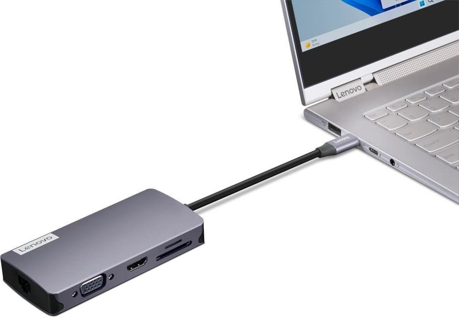 pripojenie cez USB-C, VGA, HDMI, USB-C, USB-A, gigabit ethernet, čítačka pam.kariet, pripojenie max. dvoch monitorov , 4K, power delivery 100W, materiál plast