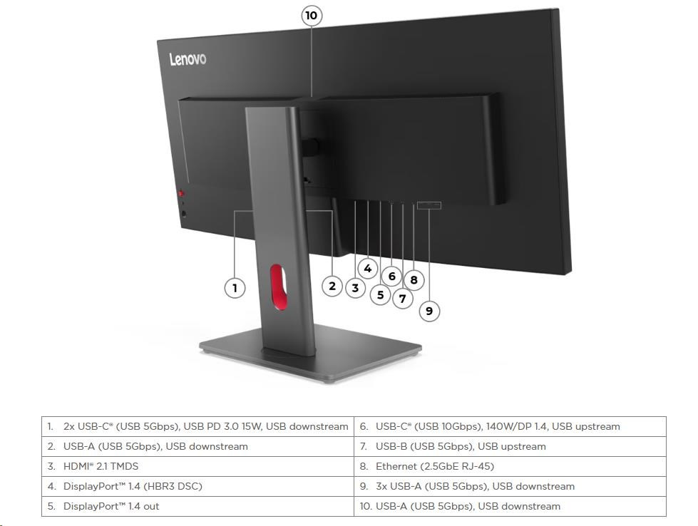 | Video signál | 1x HDMI® 2.1 TMDS, 1x DP 1.4 (HBR3), 1x DP Out, 1x USB-C® (DP 1.4 Alt Mode HBR3) |