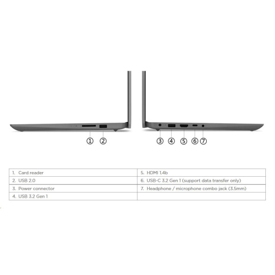 | Standartné porty | 1x USB 2.0 1x USB 3.2 Gen 1 1x USB-C® 3.2 Gen 1 (support data transfer only) 1x HDMI® 1.4b 1x Headphone / microphone combo jack (3.5mm) 1x Card reader 1x Power connector |