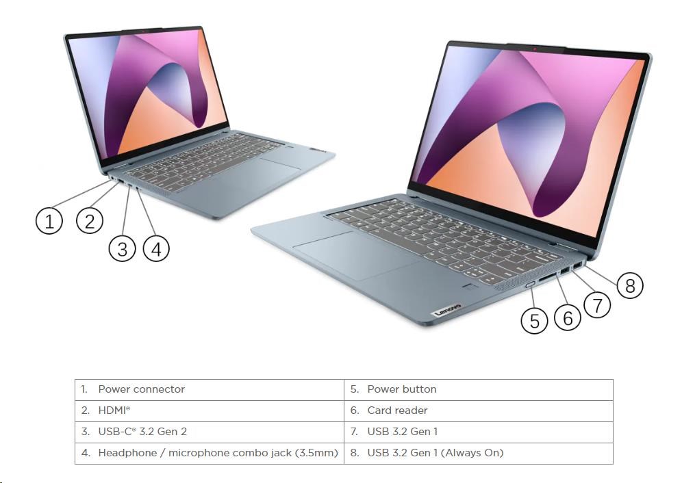 | Standartné porty | 1x USB-A (USB 5Gbps / USB 3.2 Gen 1) 1x USB-A (USB 5Gbps / USB 3.2 Gen 1), Always On 1x USB-C® (USB 10Gbps / USB 3.2 Gen 2), with USB PD 3.0 and DisplayPort™ 1.4 1x HDMI® 1.4b 1x Headphone / microphone combo jack (3.5mm) 1x SD card reader 1x Power connector |