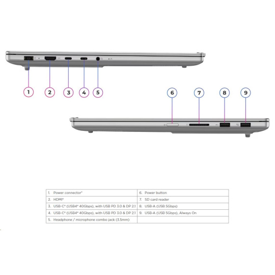 | Standartné porty | 1x USB-A (USB 5Gbps / USB 3.2 Gen 1) 1x USB-A (USB 5Gbps / USB 3.2 Gen 1), Always On 2x USB-C® (USB4® 40Gbps), with USB PD 3.0 and DisplayPort™ 2.1 1x HDMI® 2.1, up to 8K/60Hz 1x Headphone / microphone combo jack (3.5mm) 1x SD card reader Optional Ports (configured) 1x Power Connector |