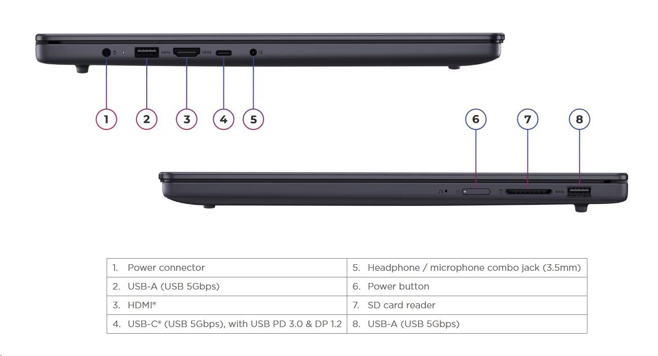| Standartné porty | 2x USB-A (USB 5Gbps / USB 3.2 Gen 1) 1x USB-C® (USB 5Gbps / USB 3.2 Gen 1), with USB PD 3.0 and DisplayPort™ 1.2 1x HDMI® 1.4 1x Headphone / microphone combo jack (3.5mm) 1x SD card reader 1x Power connector |