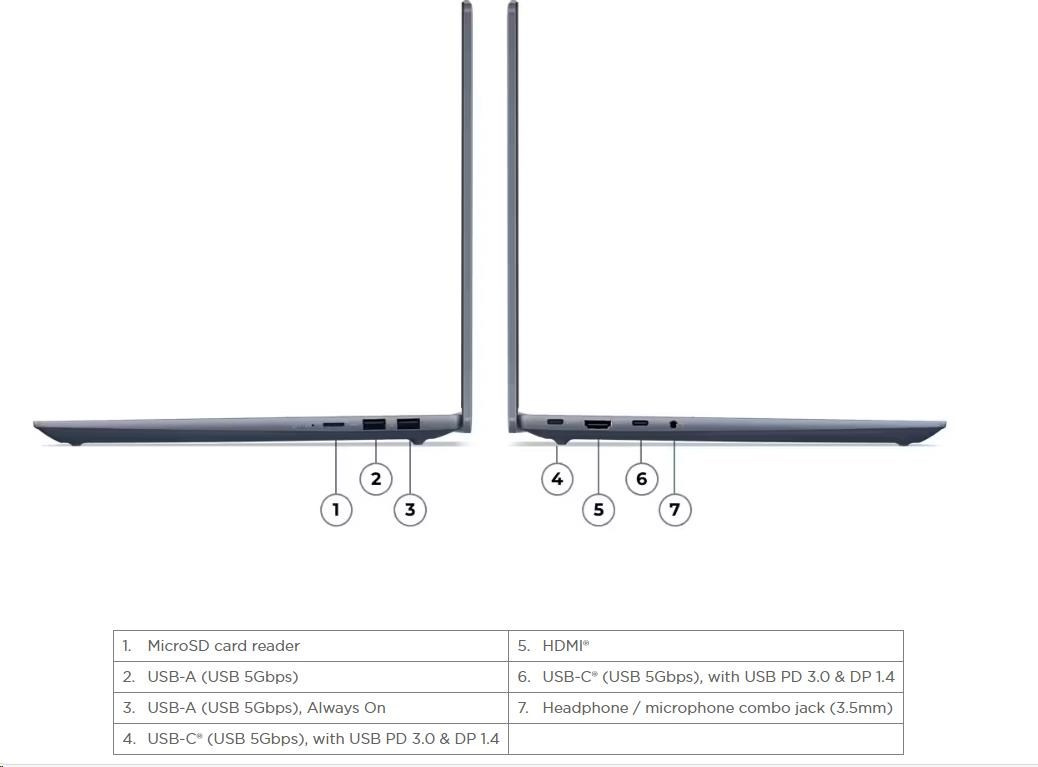 | Standartné porty | 1x USB-A (USB 5Gbps / USB 3.2 Gen 1) 1x USB-A (USB 5Gbps / USB 3.2 Gen 1), Always On 2x USB-C® (USB 5Gbps / USB 3.2 Gen 1), with USB PD 3.0 and DisplayPort™ 1.4 1x HDMI® 1.4b 1x Headphone / microphone combo jack (3.5mm) 1x microSD card reader |