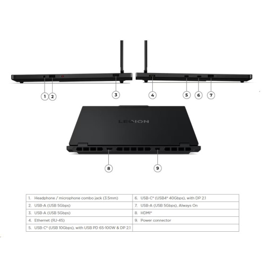 | Standartné porty | 2x USB-A (USB 5Gbps / USB 3.2 Gen 1) 1x USB-A (USB 5Gbps / USB 3.2 Gen 1), Always On 1x USB-C® (USB 10Gbps / USB 3.2 Gen 2), with USB PD 65-100W and DisplayPort™ 2.1 1x USB-C® (USB4® 40Gbps), with DP 2.1 1x HDMI® 2.1, up to 8K/60Hz 1x Headphone / microphone combo jack (3.5mm) 1x Ethernet (RJ-45) 1x Power connector |