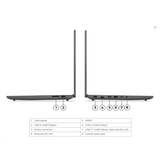 | Standartné porty | 2x USB-A (USB 5Gbps / USB 3.2 Gen 1) 1x USB-C® (USB 5Gbps / USB 3.2 Gen 1), data transfer only 1x HDMI® 2.1, up to 8K/60Hz 1x Headphone / microphone combo jack (3.5mm) 1x Ethernet (RJ-45) 1x Card reader 1x Power connector |