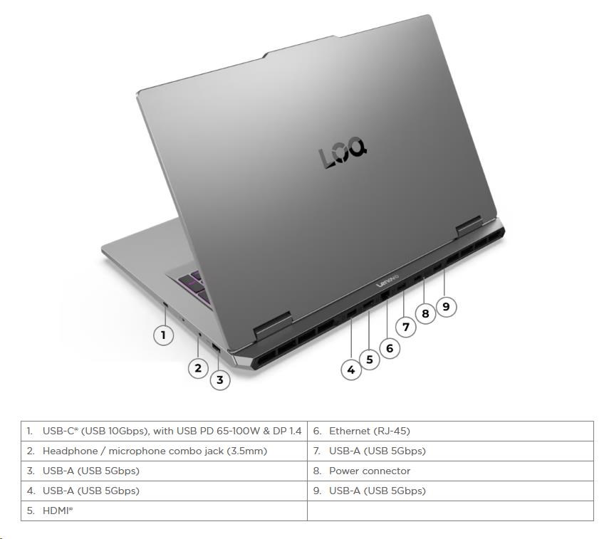 Standartné porty | 2x USB-A (USB 5Gbps / USB 3.2 Gen 1) 1x USB-C® (USB 5Gbps / USB 3.2 Gen 1), data transfer only 1x HDMI® 2.1, up to 8K/60Hz 1x Headphone / microphone combo jack (3.5mm) 1x Ethernet (RJ-45) 1x Card reader 1x Power connector |