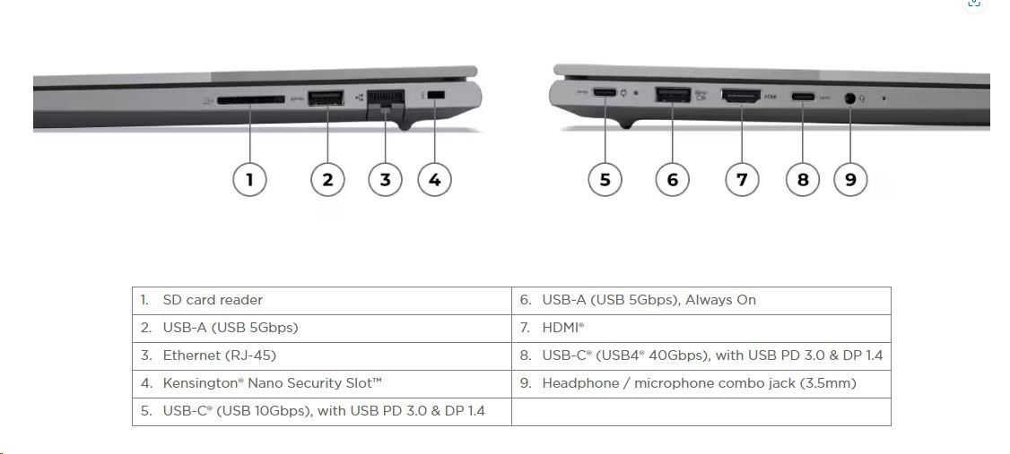 | Standartné porty | 1x USB-A (USB 5Gbps / USB 3.2 Gen 1) 1x USB-A (USB 5Gbps / USB 3.2 Gen 1), Always On 1x USB-C® (USB 10Gbps / USB 3.2 Gen 2), with USB PD 3.0 and DisplayPort™ 1.4 1x USB-C® (USB4® 40Gbps), with USB PD 3.0 and DisplayPort™ 1.4 1x HDMI® 2.1, up to 4K/60Hz 1x Headphone / microphone combo jack (3.5mm) 1x Ethernet (RJ-45) 1x SD card reader |