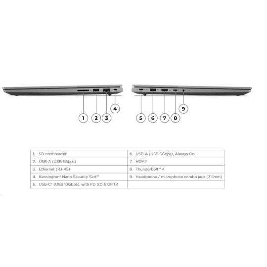 | Standartné porty | 1x USB-A (USB 5Gbps / USB 3.2 Gen 1) 1x USB-A (USB 5Gbps / USB 3.2 Gen 1), Always On 1x USB-C® (USB 10Gbps / USB 3.2 Gen 2), with USB PD 3.0 and DisplayPort™ 1.4 1x USB-C® (Thunderbolt™ 4 / USB4® 40Gbps), with USB PD 3.0 and DisplayPort™ 1.4 1x HDMI® 2.1, up to 4K/60Hz 1x Headphone / microphone combo jack (3.5mm) 1x Ethernet (RJ-45) 1x SD card reader |