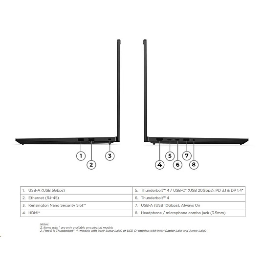 | Standartné porty | 1x USB-A (USB 5Gbps / USB 3.2 Gen 1) 1x USB-A (USB 10Gbps / USB 3.2 Gen 2), Always On 1x USB-C® (Thunderbolt™ 4 / USB4® 40Gbps), with USB PD 45-65W and DisplayPort™ 2.1 1x HDMI® 2.1, up to 4K/60Hz 1x Headphone / microphone combo jack (3.5mm) 1x Ethernet (RJ-45) Optional Ports (configured) 1x USB-C® (Thunderbolt™ 4 / USB4® 40Gbps), with USB PD 45-65W and DisplayPort™ 2.1 |