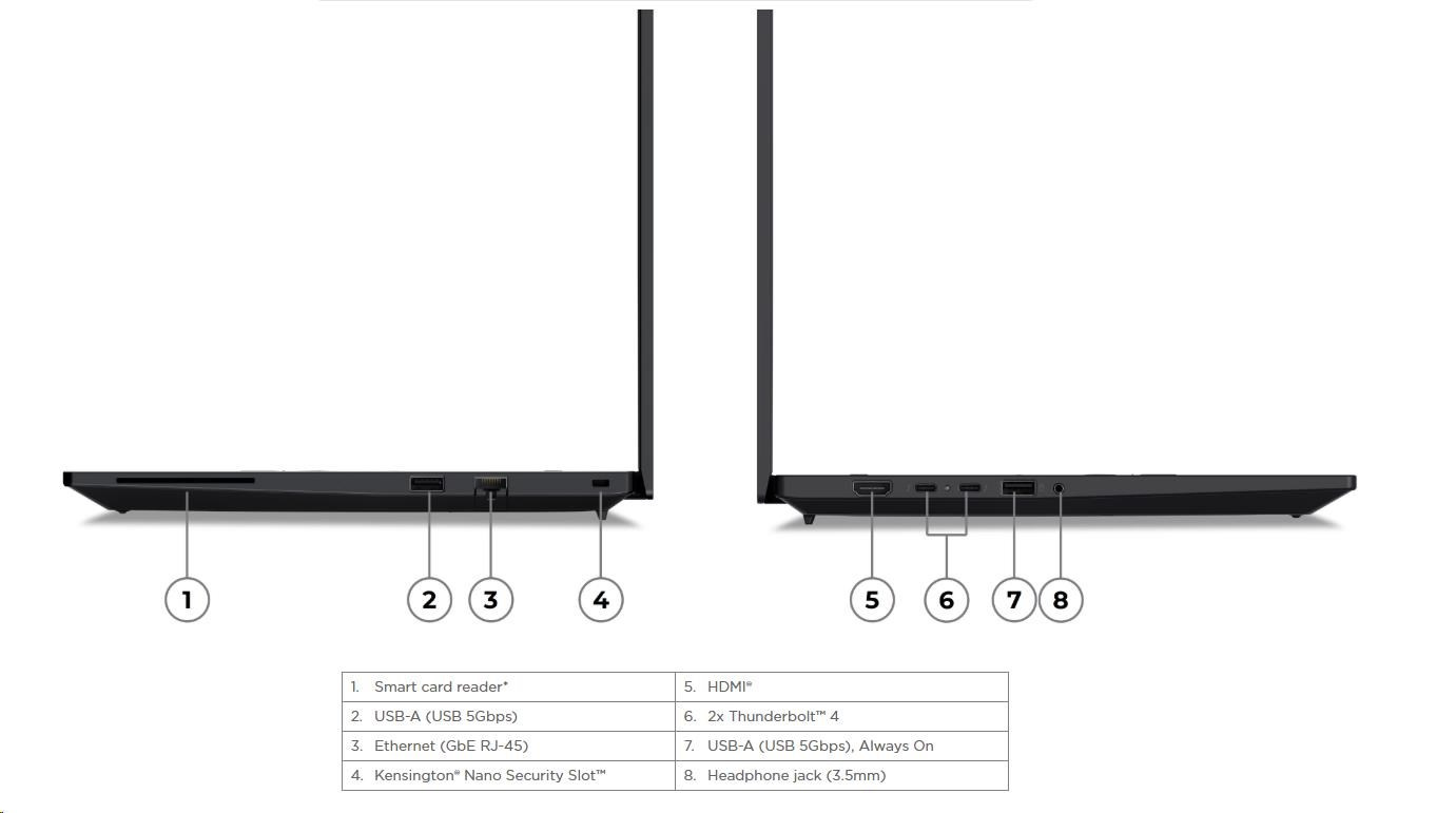 | Standartné porty | 1x USB-A (USB 5Gbps / USB 3.2 Gen 1) 1x USB-A (USB 5Gbps / USB 3.2 Gen 1), Always On 2x Thunderbolt™ 4, with USB PD 3.0 1x HDMI® 2.1, up to 4K/60Hz 1x Headphone / microphone combo jack (3.5mm) 1x Ethernet (GbE RJ-45) 1x Security keyhole 1x Smart Card Reader |