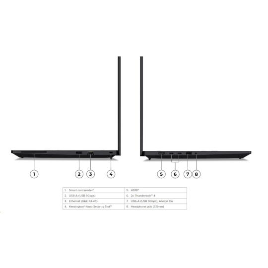 | Standartné porty | 1x USB-A (USB 5Gbps / USB 3.2 Gen 1) 1x USB-A (USB 5Gbps / USB 3.2 Gen 1), Always On 2x Thunderbolt™ 4, with USB PD 3.0 1x HDMI® 2.1, up to 4K/60Hz 1x Headphone / microphone combo jack (3.5mm) 1x Ethernet (GbE RJ-45) 1x Security keyhole 1x Smart Card Reader |