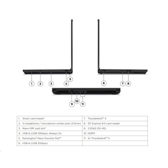 | Standartné porty | 1x USB-A (USB 10Gbps / USB 3.2 Gen 2), Always On 1x USB-A (USB 10Gbps / USB 3.2 Gen 2) 2x Thunderbolt™ 5, with DisplayPort™ 2.1 and USB PD 3.1, 180W input / 15W output 1x Thunderbolt™ 4, with DisplayPort™ 2.1 and USB PD 3.1, 180W input / 15W output 1x HDMI® 2.1, up to 8K/60Hz 1x Headphone / microphone combo jack (3.5mm) 1x Ethernet (2.5GbE RJ-45) 1x SD Express 8.0 card reader |