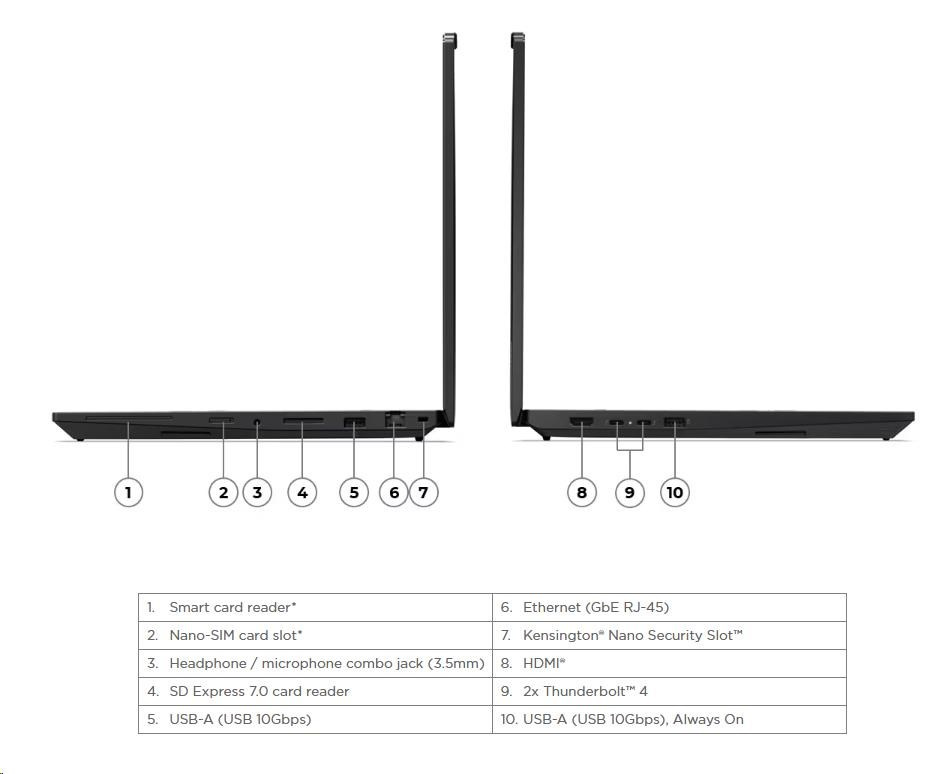 | Standartné porty | 1x USB-A (USB 10Gbps / USB 3.2 Gen 2), Always On 1x USB-A (USB 10Gbps / USB 3.2 Gen 2) 2x Thunderbolt™ 4, with USB PD 3.1, 140W input / 15W output 1x HDMI® 2.1, up to 8K/60Hz 1x Headphone / microphone combo jack (3.5mm) 1x Ethernet (GbE RJ-45) 1x SD Express 7.0 card reader 1x Security keyhole |