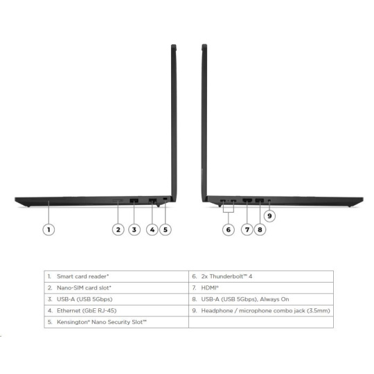 | Standartné porty | 1x USB-A (USB 5Gbps / USB 3.2 Gen 1) 1x USB-A (USB 5Gbps / USB 3.2 Gen 1), Always On 2x USB-C® (Thunderbolt™ 4 / USB4® 40Gbps), with PD 3.0 and DisplayPort™ 1.4 1x HDMI® 2.1, up to 4K/60Hz 1x Headphone / microphone combo jack (3.5mm) 1x Ethernet (RJ-45) 1x Security keyhole |