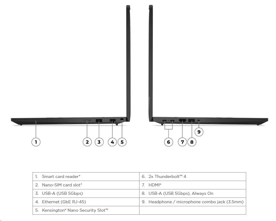 | Standartné porty | 1x USB-A (USB 5Gbps / USB 3.2 Gen 1) 1x USB-A (USB 5Gbps / USB 3.2 Gen 1), Always On 2x USB-C® (Thunderbolt™ 4 / USB4® 40Gbps), with PD 3.0 and DisplayPort™ 1.4 1x HDMI® 2.1, up to 4K/60Hz 1x Headphone / microphone combo jack (3.5mm) 1x Ethernet (RJ-45) 1x Security keyhole |