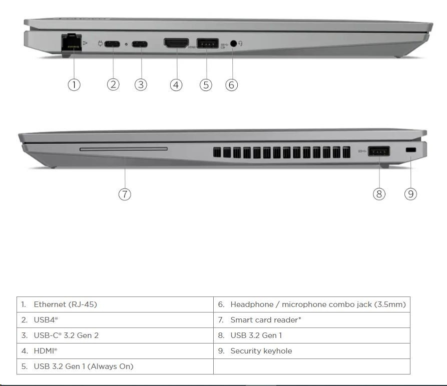 | Standartné porty | 2x USB 3.2 Gen 1 (one Always On) 1x USB-C® 3.2 Gen 2 (support data transfer, Power Delivery 3.0 and DisplayPort™ 1.4) 1x USB4® 40Gbps (support data transfer, Power Delivery 3.0 and DisplayPort™ 1.4) 1x HDMI® 2.1, up to 4K/60Hz 1x Ethernet (RJ-45) 1x Headphone / microphone combo jack (3.5mm) 1x Security keyhole  |