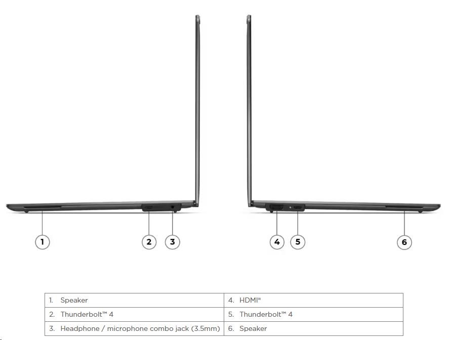 | Standartné porty | 2x USB-C® (Thunderbolt™ 4 / USB4® 40Gbps), with USB PD 3.0 and DisplayPort™ 2.1 1x HDMI® 2.1, up to 4K/60Hz 1x Headphone / microphone combo jack (3.5mm) |