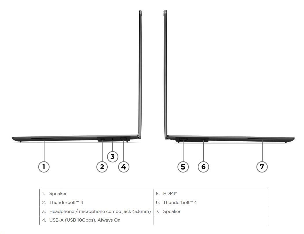 | Standartné porty | 1x USB-A (USB 10Gbps / USB 3.2 Gen 2), Always On 2x USB-C® (Thunderbolt™ 4 / USB4® 40Gbps), with USB PD 3.0 and DisplayPort™ 2.1 1x HDMI® 2.1, up to 4K/60Hz 1x Headphone / microphone combo jack (3.5mm) |